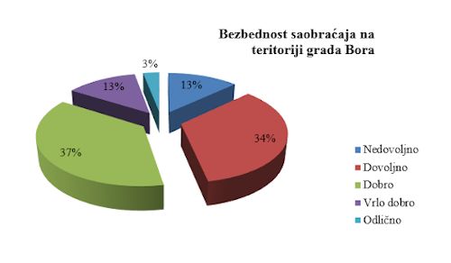 U istraživanju koje je sprovelo udruženje Sigurne staze najveći procenat ispitanika je bezbednost saobraćaja u Boru ocenio dobrom ocenom (37%), a potom sledi dovoljna ocena (34%). S druge strane, svega 3% ispitanika smatra da je bezbednost saobraćaja u Boru odlična. Razlog ovako loših ocena stanja bezbednosti saobraćaja u Boru, može biti povezan i sa lošim ocenama građana o tome kakvo je postupanje vozača prema ranjivim učesnicima u saobraćaju (pešaci, biciklisti, deca, osobe sa invaliditetom i slično). Najveći procenat ispitanika (37%) postupanje vozača ocenjuje dovoljnom ocenom, a potom slede dobra (28%) i nedovoljna (27%) .