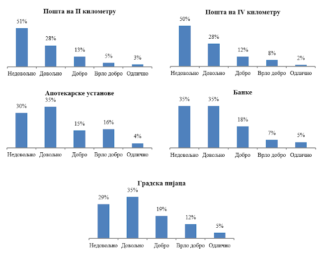 U vezi sa prethodnim slikama, pripremljena je lista objekata atrakcije u gradu Boru za koje su ispitanici navodili stavove o nivou pristupačnosti. Stavovi ispitanika za nivo pristupačnosti svakom pojedinačnom objektu su prikazani u prilogu 1., dok će u nastavku biti prikazani stavovi za objekte koji su grupisani na sledeći način: Javna uprava; Javno-komunalna preduzeća; Terminali za prevoz putnika; Pošte/Banke; Zdravstvene ustanove; Sportski i kulturni centri; i Obrazovne ustanove. Slika 10. pokazuje izrazito nezadovoljstvo pristupačnosti objektima atrakcije, kao što je to bio slučaj i na slikama 8. i 9. Međutim, može se videti da pristupačnost zdravstvenim ustanovama ima bolju ocenu stavova ispitanika za razliku od ostalih grupa, možda zbog posvećenosti potrebama osoba sa invaliditetom (rampe za kolica).